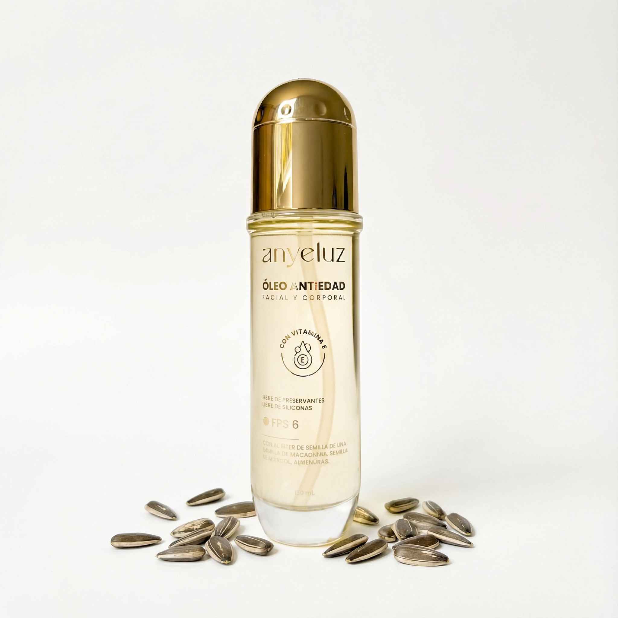 Descubre nuestro renovado oleo antiedad, ahora dermatológicamente probado y diseñado para brindar hidratación profunda, combatir los signos del envejecimiento y mejorar la elasticidad de la piel. Su fórmula renovada incluye una mayor concentración de Vitamina E y aceites vegetales como el de semilla de girasol, macadamia y almendra dulce, ricos en ácido linoleico y ácidos grasos insaturados, que nutren intensamente y fortalecen la barrera natural de la piel. Su evolucionada formulación permite que se absorba rápidamente, dejando la piel suave, radiante y protegida, mientras reduce visiblemente las líneas de expresión y las estrías. Revitaliza tu piel con nuestro óleo Antiedad. Con vitamina E, combate el envejecimiento y mejora la elasticidad. Descúbrelo ahora! Revitaliza tu piel con nuestro óleo Antiedad. Con vitamina E, combate el envejecimiento y mejora la elasticidad. Descúbrelo ahora!