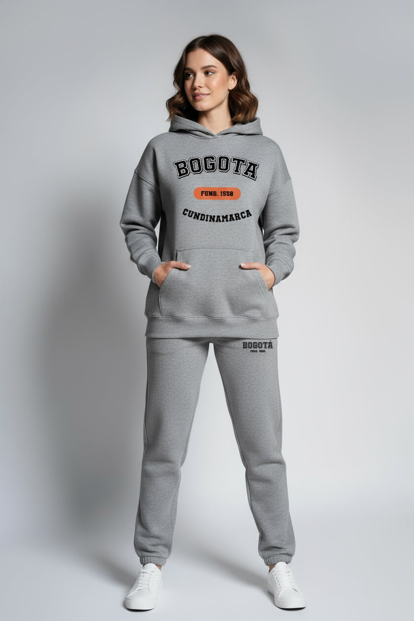 Orgullo capitalino en modo comfy. El Conjunto “Bogotá 1538” incluye hoodie con bolsillo canguro y jogger con pretina ajustable, ambos en fleece suave y corte regular unisex. El arte universitario “BOGOTÁ • FUND. 1538 • CUNDINAMARCA” va centrado en el pecho y con mini print coordinado en la pierna para un look limpio y versátil—ideal para estudio, viaje o relax.