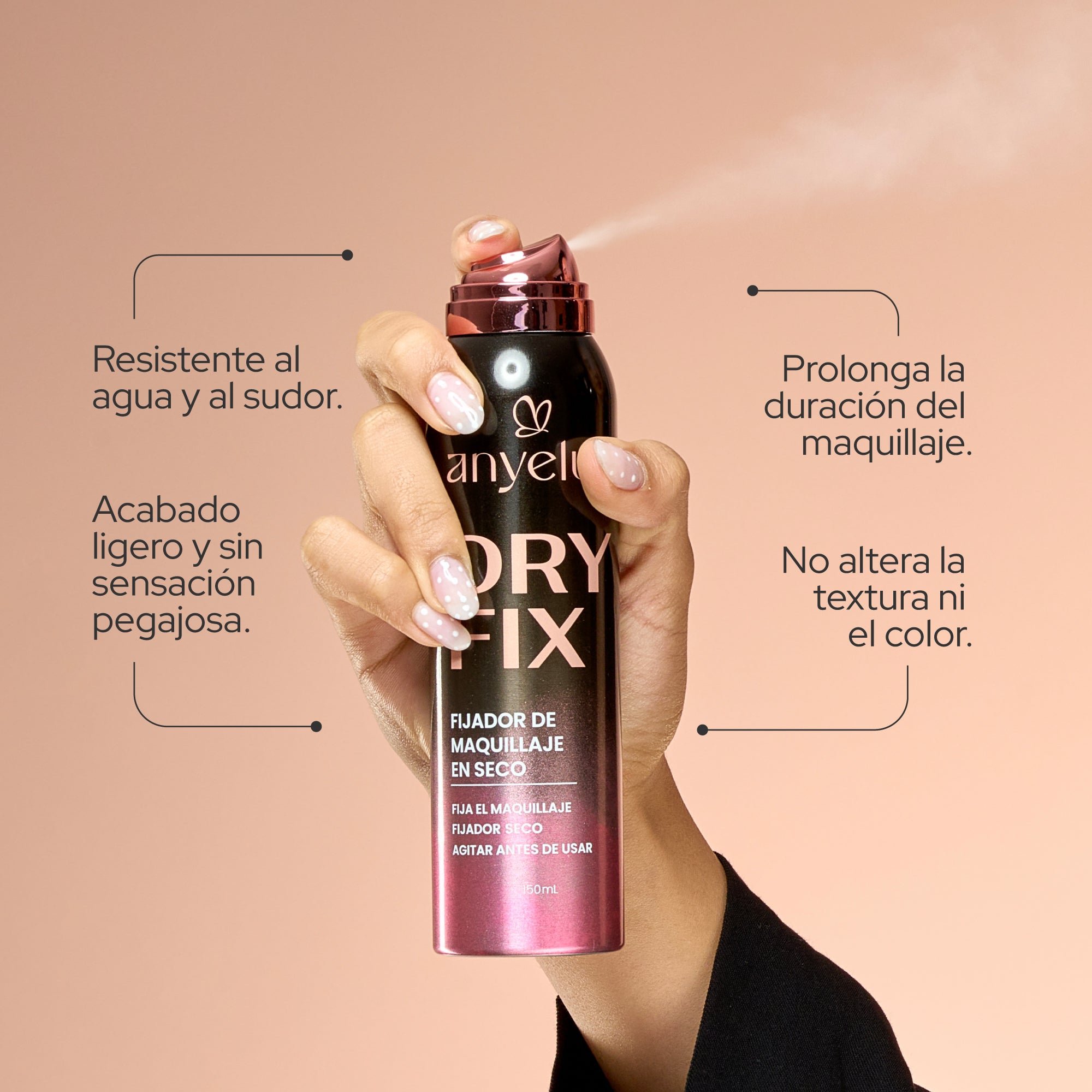 Dry Fix es un fijador en seco resistente al agua que sella el maquillaje al instante y prolonga su duración por horas. Su fórmula en aerosol crea una capa ligera que fija, matifica y protege el look sin dejar sensación pesada.