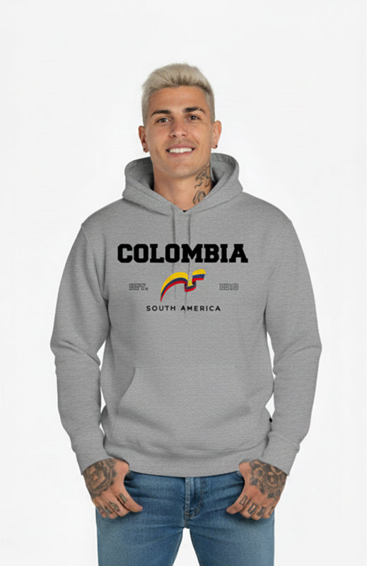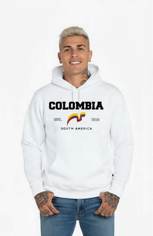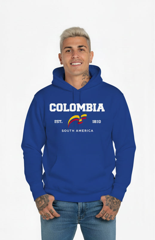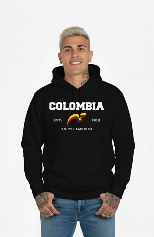 Orgullo nacional en clave varsity. El Hoodie “Colombia EST. 1810 – South America” combina tipografía universitaria con emblema inspirado en la bandera para un look limpio y moderno. Interior afelpado, fit regular unisex, capucha ajustable y bolsillo canguro: perfecto para clima fresco, viaje o para llevar Colombia en el pecho todos los días.