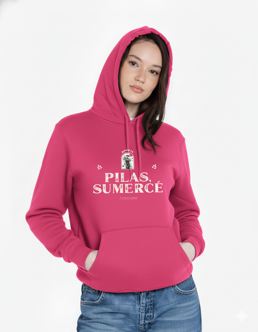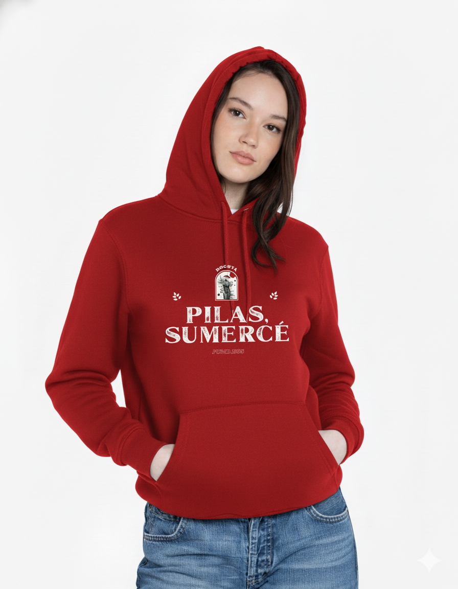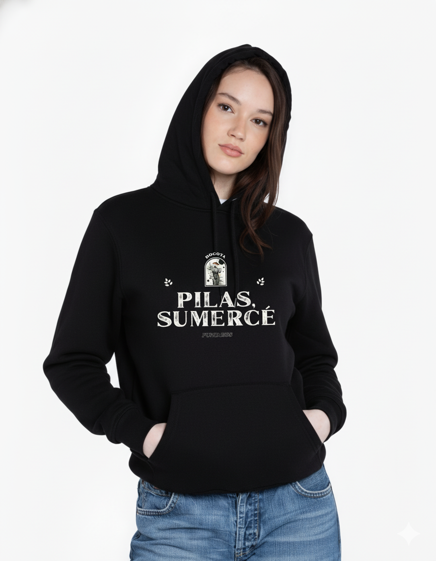 Humor rolo con estilo clásico. El Hoodie “Pilas, Sumercé” – Bogotá Edition rinde homenaje a una de las frases más queridas de la capital. Su diseño combina tipografía vintage, detalles decorativos y un sello gráfico inspirado en Bogotá, logrando una prenda llena de identidad y autenticidad.