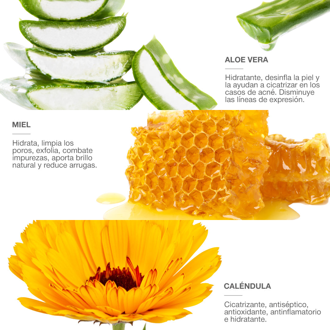 Con activos como la Niacinamida, Ácido Hialurónico y extractos naturales como Miel, Rosa Centifolia, Caléndula y Aloe Vera que hidratan, regeneran y seborregulan hasta las pieles más sensibles, sin resecarlas ni alterar el pH. Dermatológicamente comprobado, sin sulfatos, ultrasuave y de baja irritación