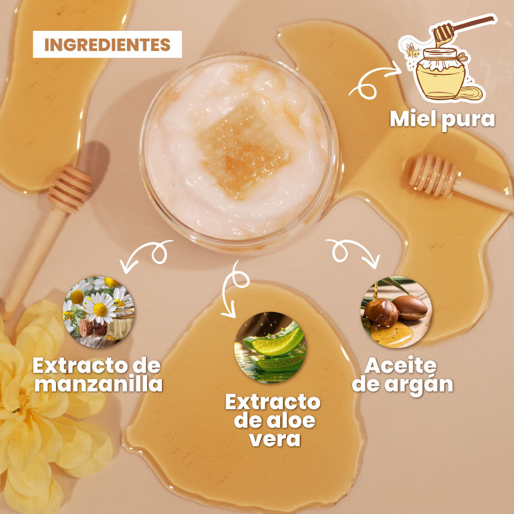 Está enriquecida con aloe vera, aceite de argán, manzanilla y miel pura. Una mezcla que une la sabiduría de la naturaleza con el poder reparador de la colmena. Estos ingredientes trabajan en armonía para fortalecer la fibra capilar, mejorar la textura del cabello y facilitar el desenredado, dejando una sensación sedosa y ligera.